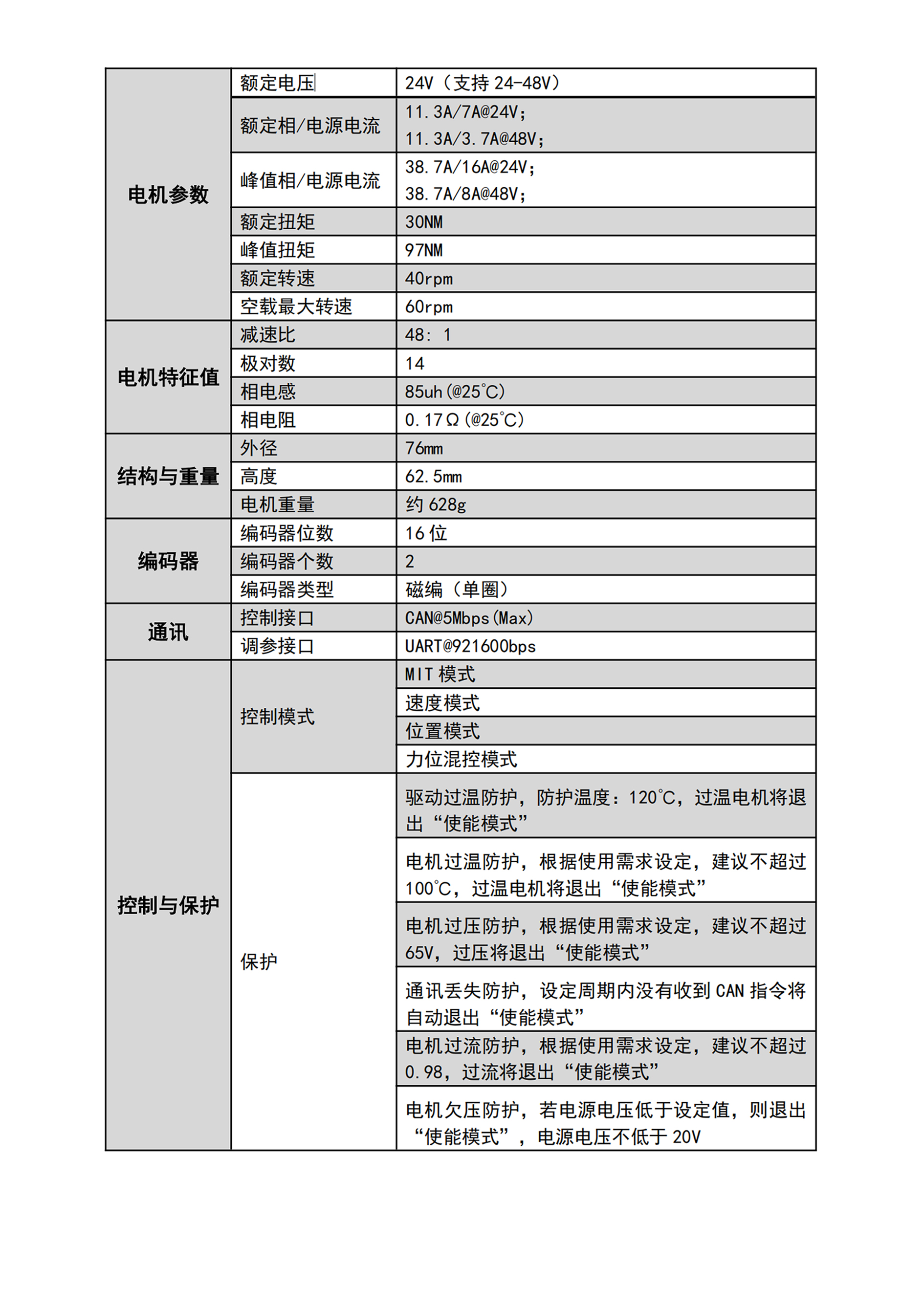 5. 可通过CAN总线反馈电机速度、位置、转矩、电机温度等信息。